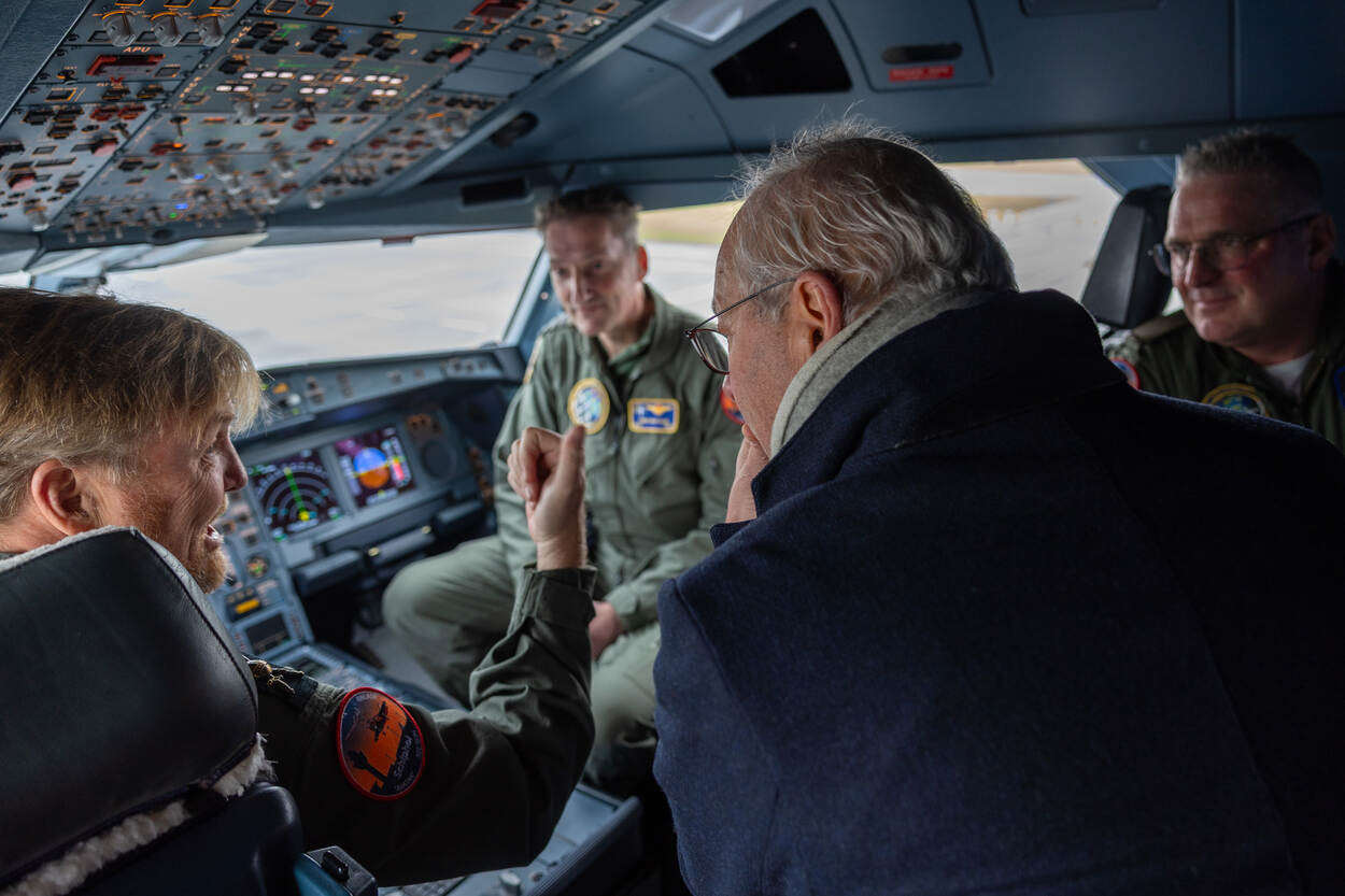De Airbus A330-MRTT landde wel. De koning kreeg hier een kijkje aan boord van het tank- en transportvliegtuig. Hij nam onder meer plaats in de cockpit. Daar is hij bijgepraat over tankoperaties, onder meer zoals die zijn uitgevoerd tijdens de oefening.