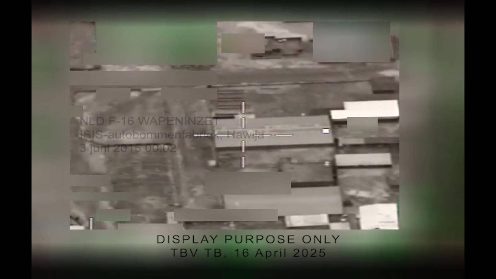 Videobeelden van de aanval van een Nederlandse F-16 op een autobommenfabriek van ISIS. Dit gebeurde 3 juni 2015 om 00:02 uur ’s nachts in Hawija, Irak.