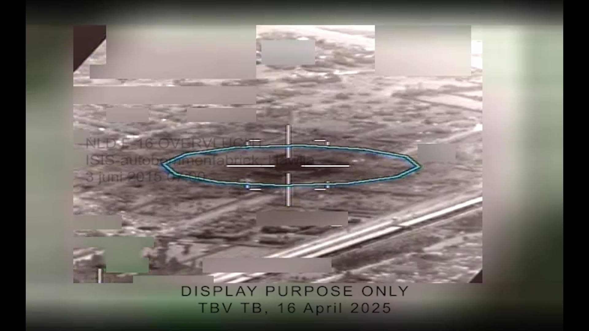 Videobeelden die Nederlandse F-16 op 3 juni 2015 om 07.00 uur maakte boven Hawija, in Irak. De F-16-vlucht was na een aanval die nacht op een autobommenfabriek van ISIS.