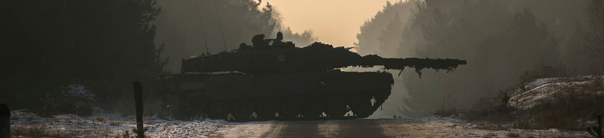 Een Leopard 2 A6-gevechtstank rijdt door een besneeuwd Duits oefenterrein, februari 2017.