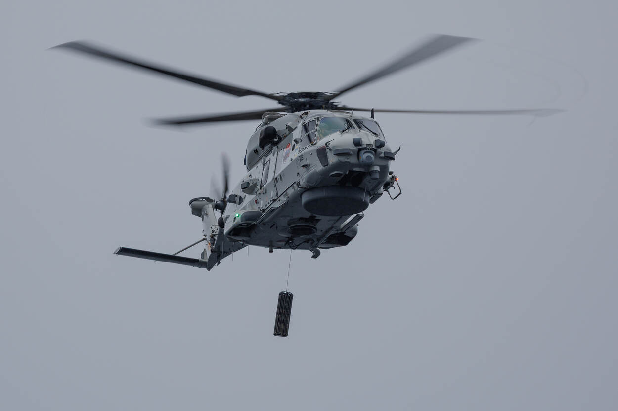 Nederlandse NH90 helikopter met daaronder de Long-Range Active Sonar.